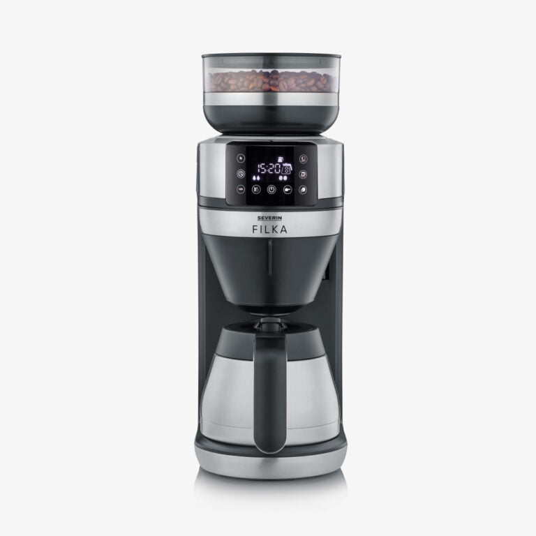 Severin FILKA con jarra termo de acero inoxidable — una cafetera de filtro totalmente automática que muele los granos al momento y prepara la cantidad exacta de café con solo tocar un botón. FILKA integra preinfusión y una temperatura de preparación optimizada para extraer el aroma del café, y su control "Cup Control" dosifica automáticamente el agua según la cantidad seleccionada (taza pequeña, taza grande, vaso para llevar, jarra de cristal o jarra termo inoxidable).