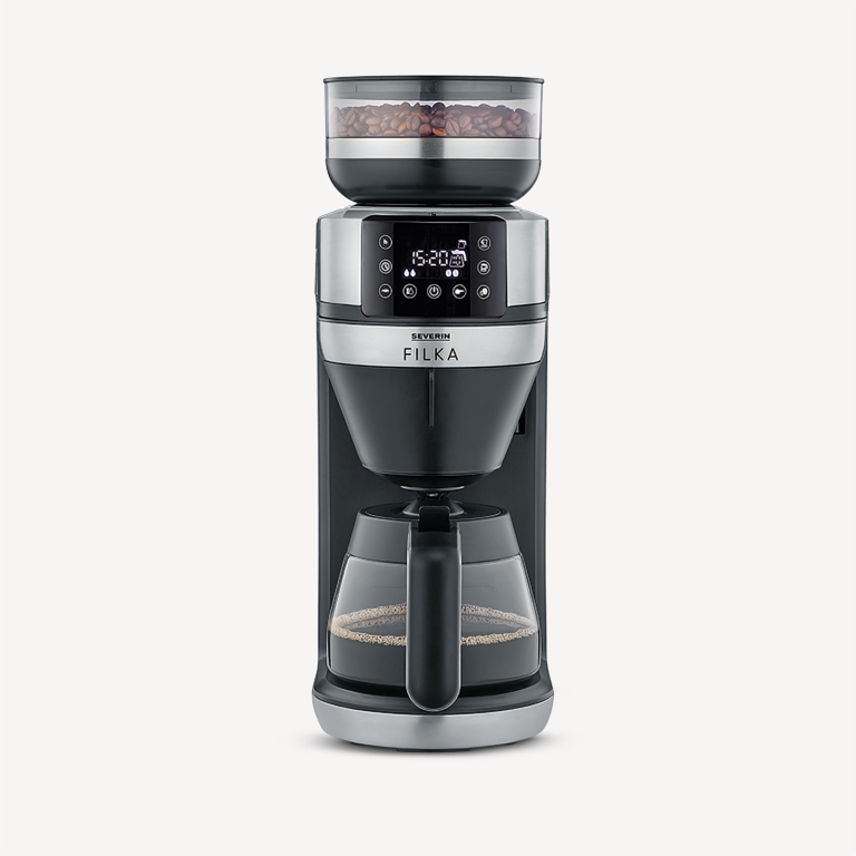 La cafetera Severin FILKA con jarra de vidrio reúne la comodidad de una máquina totalmente automática con el sabor clásico del café de filtro recién molido. Con la tecnología "Cup Control" puedes preparar la cantidad exacta de café para una taza pequeña, una taza grande, para 2 personas o directamente en la jarra de cristal, todo con solo pulsar un botón.
