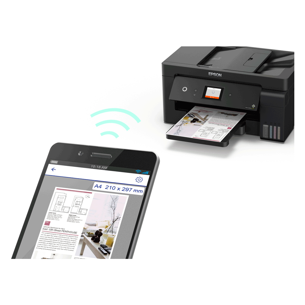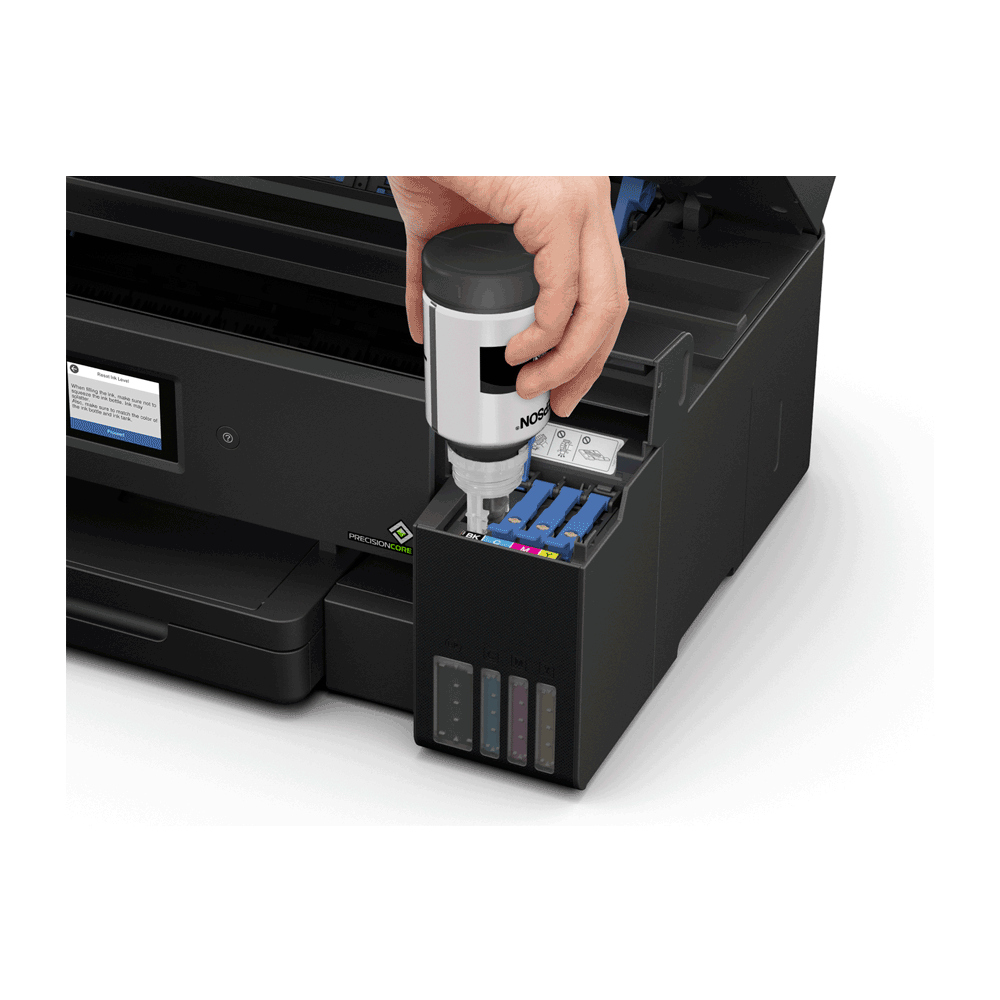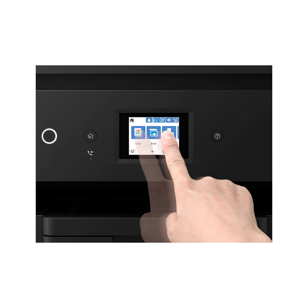 Su capacidad de papel es flexible: bandeja frontal para volumen de trabajo (hasta 250 hojas para papel normal) y alimentación trasera para soportar formatos especiales hasta A3+ (329 x 483 mm) o trabajos largos definidos por el usuario. El equipo viene con una pantalla táctil en color para operar sin PC y está pensado para reducir costos de tinta (Epson indica ahorros de hasta 90% respecto a cartuchos según uso y condiciones).