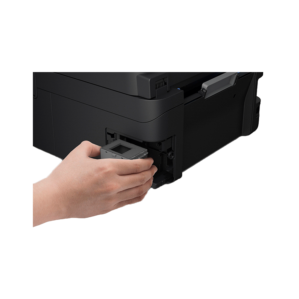 El equipo también incluye funciones prácticas para flujo de trabajo: bandeja principal de 100 hojas, impresión sin bordes hasta 10x15 cm, escáner CIS con resolución óptica alta y software Epson (ScanSmart, Epson Smart Panel y utilidades de fax). La construcción incorpora componentes con eficiencia energética y un tamaño pensado para espacios reducidos.