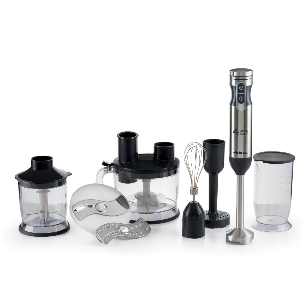 Incluye un accesorio tipo pimer de inmersión con 4 cuchillas y vástago de acero inoxidable, una picadora de 500 ml (apta también para hielo y granizados), accesorio batidor, triturador de patatas y discos para rallar, cortar en juliana y rebanar. Estas piezas permiten pasar de preparar batidos a cortar verduras en juliana o lograr un puré cremoso en minutos.
