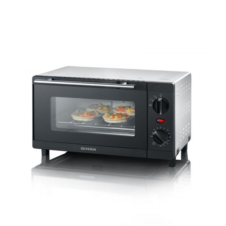 Hornito Tostador SEVERIN 9L (TO 2052) — Mini horno de sobremesa compacto que combina potencia y simplicidad para preparar snacks, panecillos, mini pizzas y recalentar raciones pequeñas. Su diseño reducido lo hace ideal para cocinas con espacio limitado o para estudiantes y oficinas, ofreciendo resultados rápidos y uniformes gracias a sus resistencias superiores e inferiores regulables.