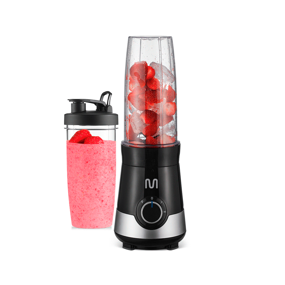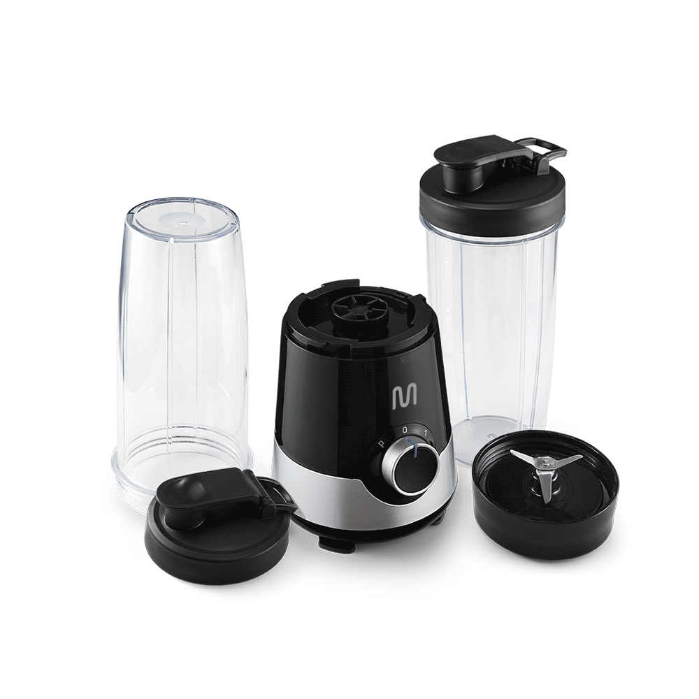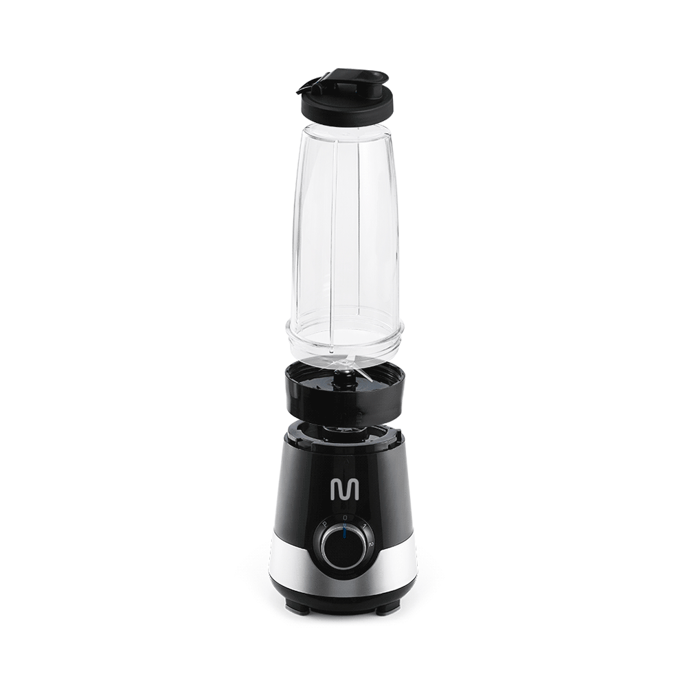 Incluye dos vasos enroscables de 800 ml con tapa para transportar tus preparaciones sin derrames, además de cuchillas de acero inoxidable que aseguran corte eficiente y mayor durabilidad. El diseño incorpora función pulso y control por velocidades (3 niveles) para ajustar la textura según la receta. La licuadora también dispone de tapa con cierre y pies antideslizantes que aportan seguridad durante el uso.
